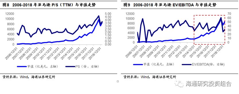 对于类似亚马逊的分阶段成长的重资产型公司,不同阶段应选用不同估值方法。在快速扩张发展期,即亚马逊零售业务初期至成长期(1995-2005年)和云计算业务初期至成长期前期(2006-2014年),受研发及营销费用较多、AWS采用“超低价+巨量+微薄利润”营销原则、大量并购影响,公司负债折旧高,现金流和净利润较少,常使用P/S估值法。对比亚马逊P/S(TTM)与市值走势情况,2014-2019年P/S在1.6-4.7x区间内波动,与市值实现同涨同跌。在云计算成长中后期(2014年后)&零售产业稳定成熟期(2015年后),前期并购带来的折旧摊销和商誉使得EBITDA率[1]上升,适用EV/EBITDA估值法。2013-2019年,EV/EBITDA保持在31-61x的区间范围内波动,与市值联动效果较为显著。而完全成熟的亚马逊公司业务种类较多,不同种类业务行业情况有所差异,如果按同一估值尺度来衡量会有偏差,因此根据稳定的业绩或者不同种类的业务拆分使用P/E、SOTP(分部)估值更加合理。