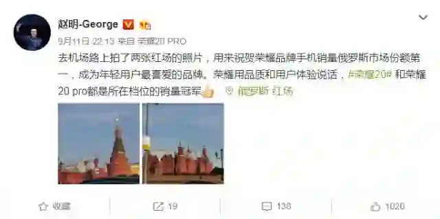 近年来,许多国产手机厂商纷纷开拓海外市场,导致海外市场竞争也异常激烈 。昨天晚上,荣耀总裁赵明发布微博称:“去机场路上拍了两张红场的照片,用来祝贺荣耀品牌手机销量获得俄罗斯市场份额第一,成为年轻用户最喜爱的品牌。”