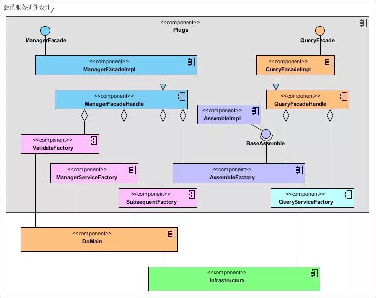 插件模式就是将系统开发看成是搭积木,将一个个功能模块做成一个个小积木。当需要一个完整功能,只需要将积木拼装在一起就可以了,模块在不同的功能之间可以重用。在设计上 Spring 的 IoC 恰巧给我们提供了便利性,利用 Spring 容器来管理我们的插件,当某一个接口需要某一个插件,直接注入就可以。当然,这里还需要我们定义好标准的插口(接口)。下面给出写服务(ManagerService)代码示例。