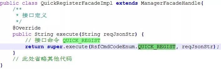 3、在上面的插件组装框架 Handle 中还有一个对象 EmsContext,该对象构建时传入了 RsfCmdCodeEnum。这个 RsfCmdCodeEnum 是一个至关重要的变量,这个变量由具体接口传入的,每一个接口对应唯一的 CmdCode,下面是一个快速注册接口的接口代码: