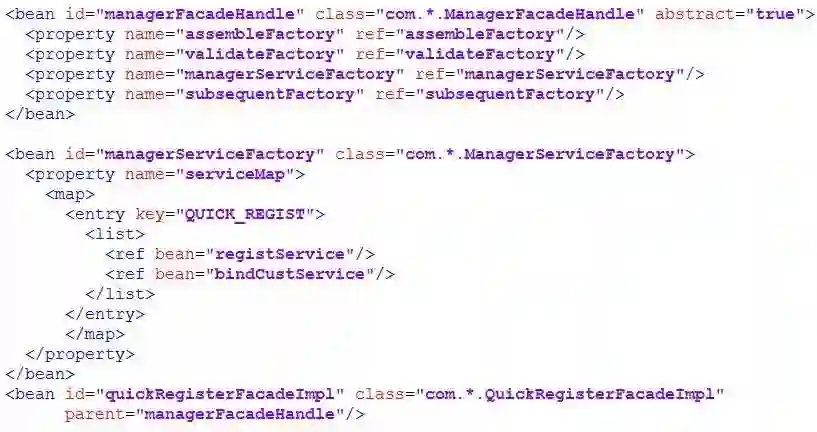 4、接下来就需要对这个接口注入各层级的插件了,我们把插件组装放在一个名为 beans-manager-facade.xml 的 XML 文件中,如下例举了一个接口的配置: