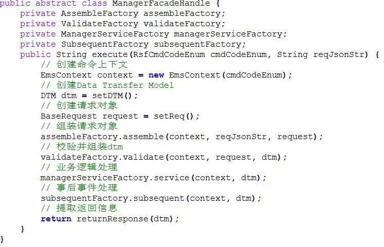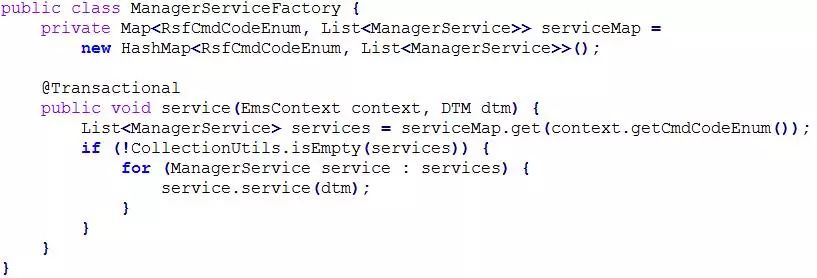 2、如上框架中列出了四个层级的插件,分别是 Assemble(入参组装与校验)、Validate(业务校验)、Manager(业务事务)、Subsequent(事务后业务)。针对框架中的各个插件结构层级,需要一个对应的插件工厂(Factory)来组装该层级的多个插件,如下列举了 Manager 插件工厂代码: