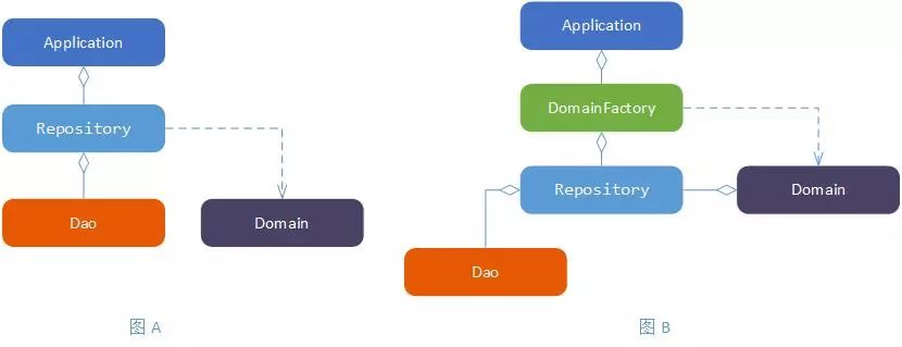 如图 A 的方式,在应用层(Application)注入 Repository 服务,在 Repository 中转化 Domain 对象,这种方式简单直接,但是很容易将 Repository 的服务做成事务脚本的模式,结果将业务由 Domain 转移到 Repository 的服务中来,做成了伪 DDD 模式。如图 B 的方式,在应用层(Application)注入 DomainFactory 服务,在 DomainFactory 中构建 Domain 对象时将 Repository 服务导入到 Domain 对象中。Application 无法直接调用 Repository 服务,只能通过 Domain 来操作 Repository 服务,这样避免了 Repository 作为上帝之手的角色。将业务封装在 Domain 中,最大可能的避免 Repository 的臃肿。