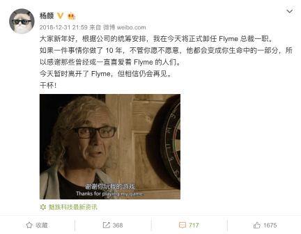 杨颜在微博中表示,根据公司的统筹安排,将在今天正式卸任Flyme总裁一职。如果一件事情你做了10年,不管你愿不愿意,他都会变成你生命中的一部分,所以感谢那些曾经或一直喜爱着Flyme的人们。另外杨颜还表示,今天暂时离开了Flyme,但相信仍会再见。