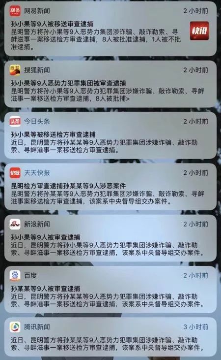 7天后,有关推送的乌龙再次发生(下图)。至少10个APP把涉黑的“孙某某”误判为“孙小果”。后者20年前因强奸等罪名被判死刑,但在不久前又堂而皇之出现在昆明的大街上,因此成为此次扫黑除恶的重点对象。但随后检方澄清:“孙某某”另有其人,并非孙小果。他们只是姓氏相同。