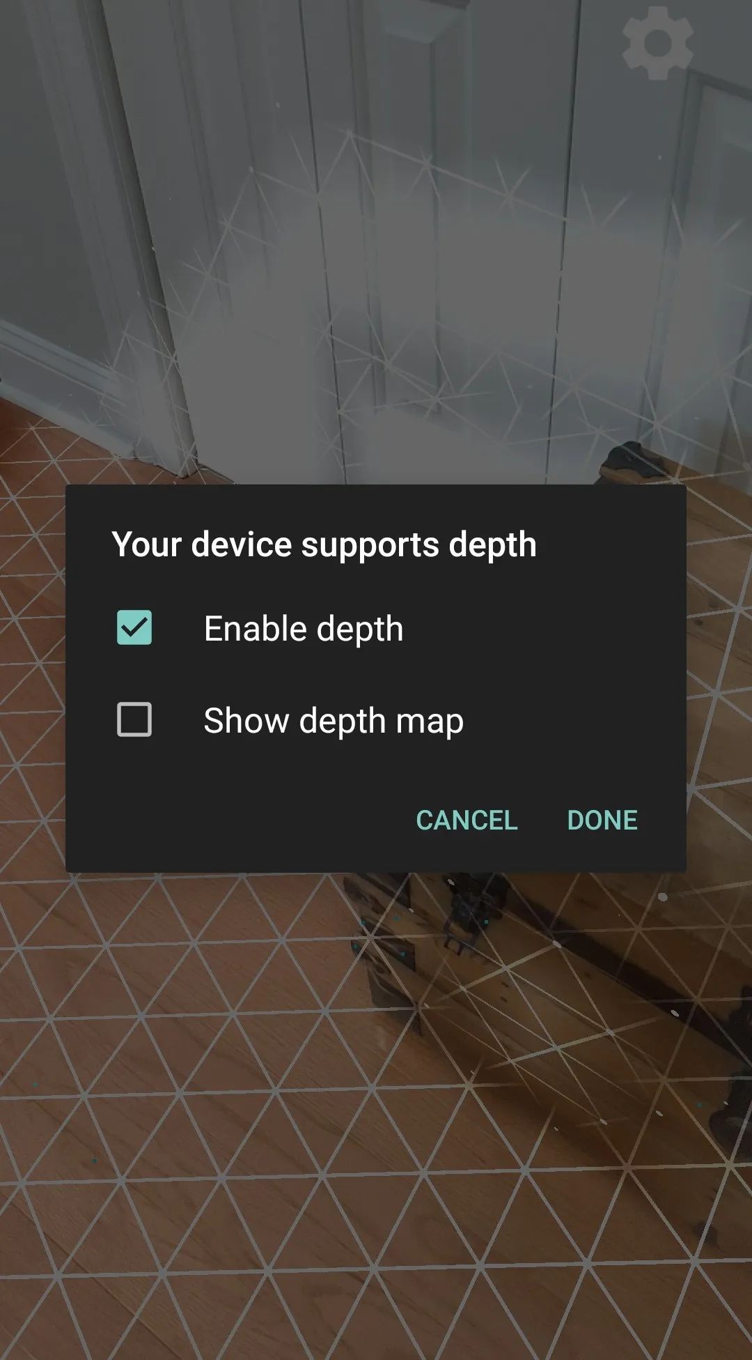 在你首次运行应用或放置 “安卓小人” 时,屏幕上会弹出对话框,提示你启用 Depth。这个对话框只会在首次启用时弹出,点击 Enable (启用),就能实现遮挡功能了。