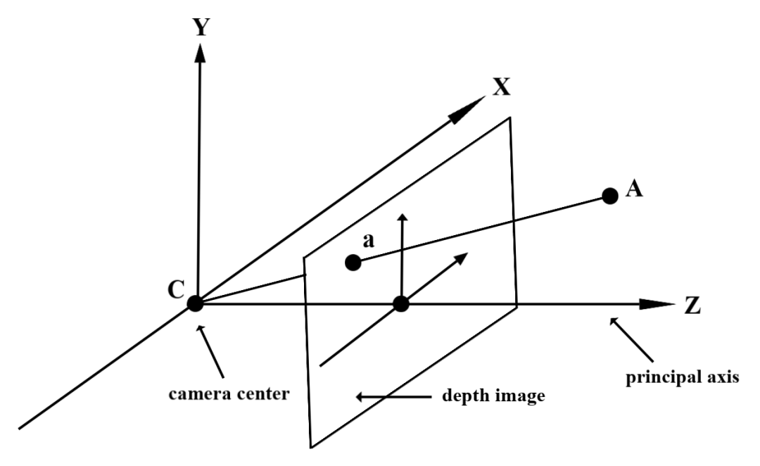 在上述这个图片中,假设 A 是真实物体表面上的一点,通过光路投射到深度图上,所对应的点以 a 来表示。在深度图中,a 这一点的深度值与 CA 投影到主光轴(principal axis)的长度相同。这个值也可以被理解为A 在 Z 轴的坐标,在以相机位置 C 为原点的坐标系里。在使用 Depth API 时要注意,我们所要了解深度值不是线段 CA 本身的长度,而是其投影的长度。