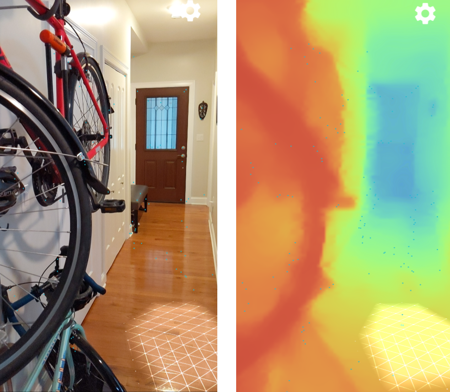 下图左边展示了一幅静态场景,里面有辆自行车挂在走廊的墙壁,右边是基于当前的相机图片所创建的深度图的可视化表示。