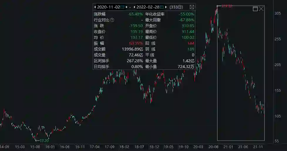 从估值的角度来看 ,2020年11月至今(2022年2月28日),阿里的股价已经从300多美元一路调整至100美元附近,整体跌幅接近70%,期间阿里的PE估值也从40倍左右降至15倍左右,基本达到了上市以来的较低水平。与此同时,如果以目前的市值简单估值,核心业务中国商业部分的PE估值也只有10倍左右,可以说无论是从横向还是纵向对比,阿里目前的估值均处在一个较为便宜的水平。