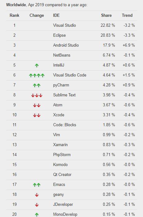 全球范围来看,微软作为最懂开发者的公司,其打造的 Visual Studio 也是最受欢迎的 IDE。此外,Android Studio 的采用率在过去 5 年中也增长最多,达到 14.5%。而 Eclipse 和 Java 有着看似息息相关的命运,在过去 5 年里丢失了最多的份额,以 -16.2% 的数据垫底。