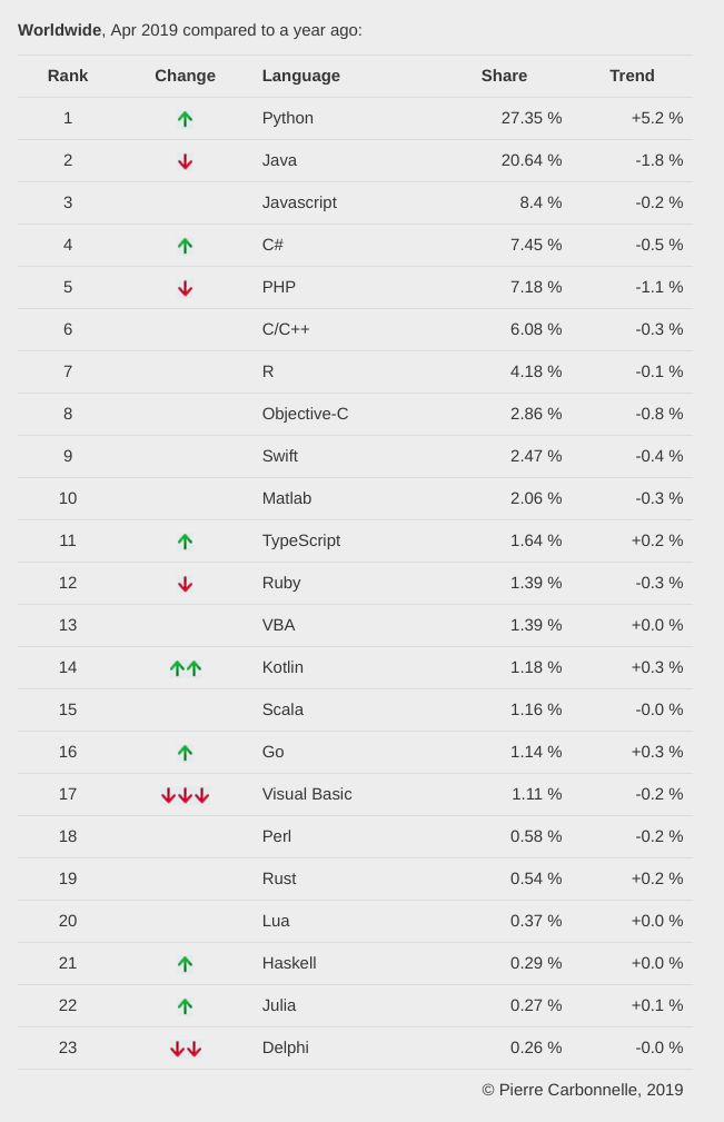 PYPL(PopularitY of Programming Language,编程语言流行指数) 四月榜单已发布,目前包含四个排行榜,分别是编程语言、IDE、ODE(Online IDE) 以及数据库。