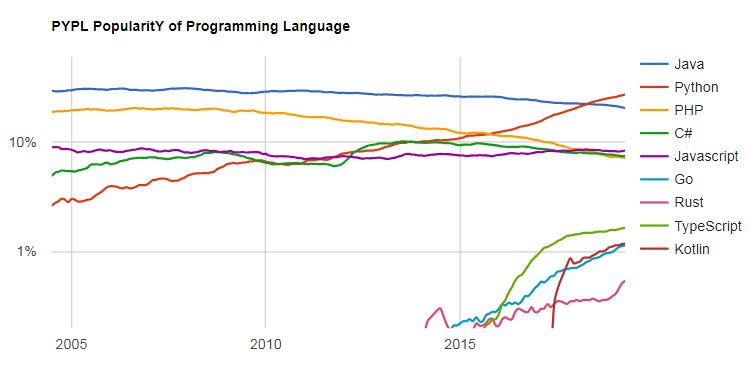▲TOP 5 编程语言和新兴的热门编程语言 PYPL 指数趋势图