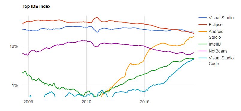 同样不可忽视的还有 Visual Studio Code,它的增长势头可谓是一骑绝尘。