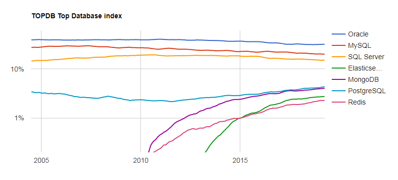 排名前五的分别是:Oracle, MySQL, SQL Server, PostgreSQL 和 MongoDB。数据库这种作为基础设施存在的工具,一旦确定,很长一段时间也不会改变。