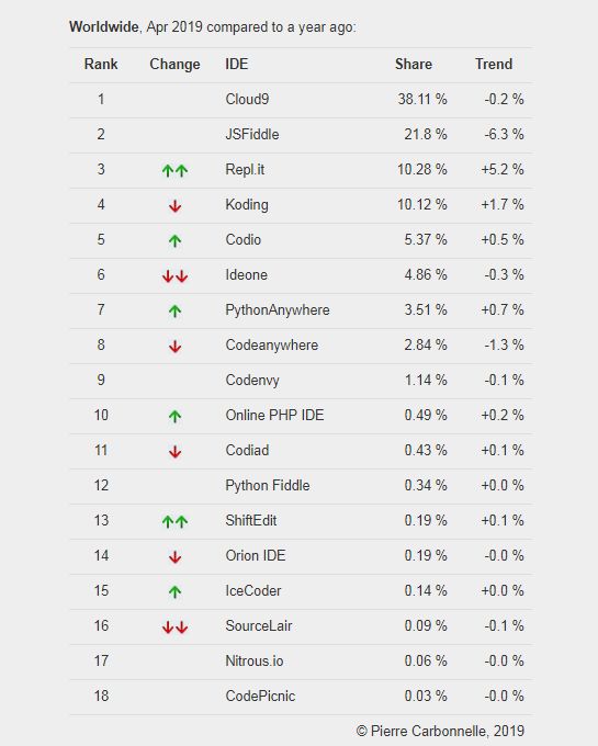 最后看看 ODE(Online IDE),由于在线 IDE 在国内的流行度不是很高,这里就不细说了,直接看看排行榜。