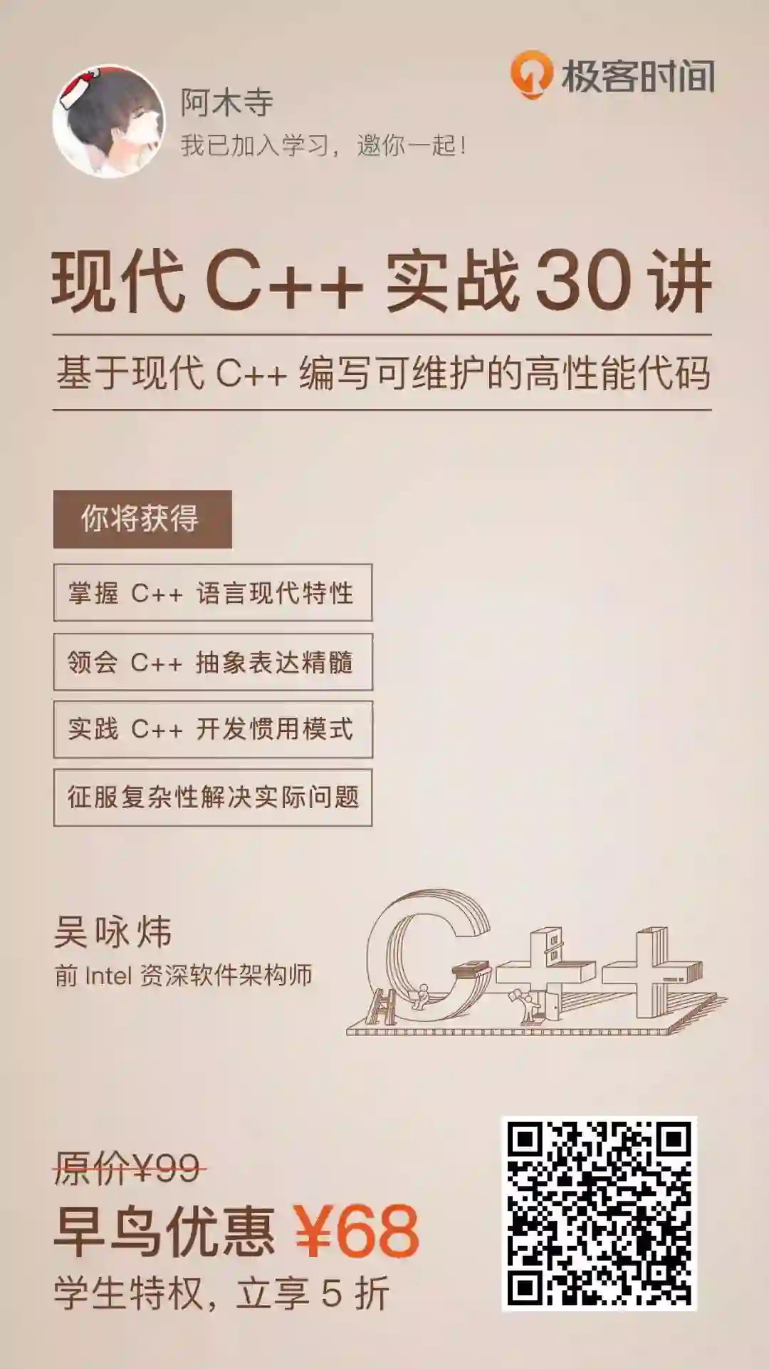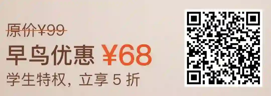1、早鸟价 ¥68,原价 ¥99。结算时,输入优惠口令「CPLUSPLUS」再减 5 元,到手价 ¥63,口令仅限「前 200 人」有效。