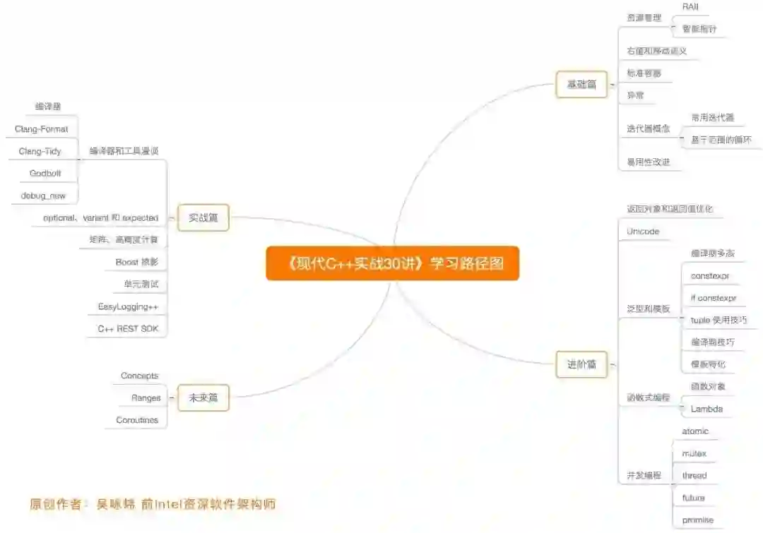 这些新功能是什么?为什么让C++变得更容易了?我想你可以在专栏《现代C++实战30讲》中找到答案。想高效学习 C++?我特别认同专栏作者前 Intel 资深软件架构师吴咏炜列出的这份学习路径,作者深耕 C++ 语言 30 年,相信肯定对你有帮助: