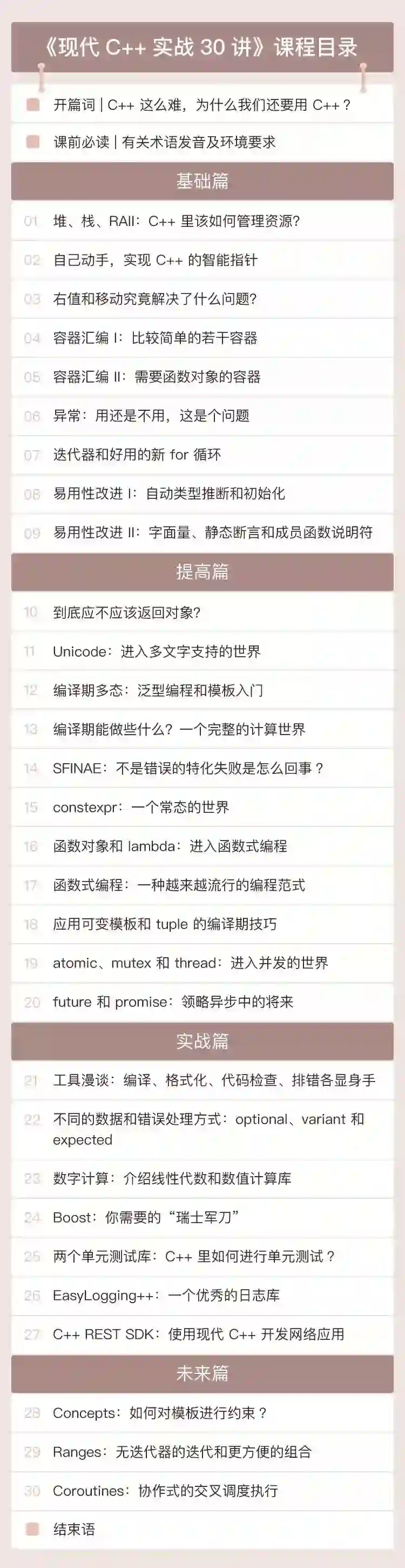 希望你在学习了本专栏之后,能够知道某个 C++ 的功能为什么存在和应该在什么情况下使用。那样的话,本专栏的目的就达到了。下面是本专栏的目录,可以一览你将会学到的内容: