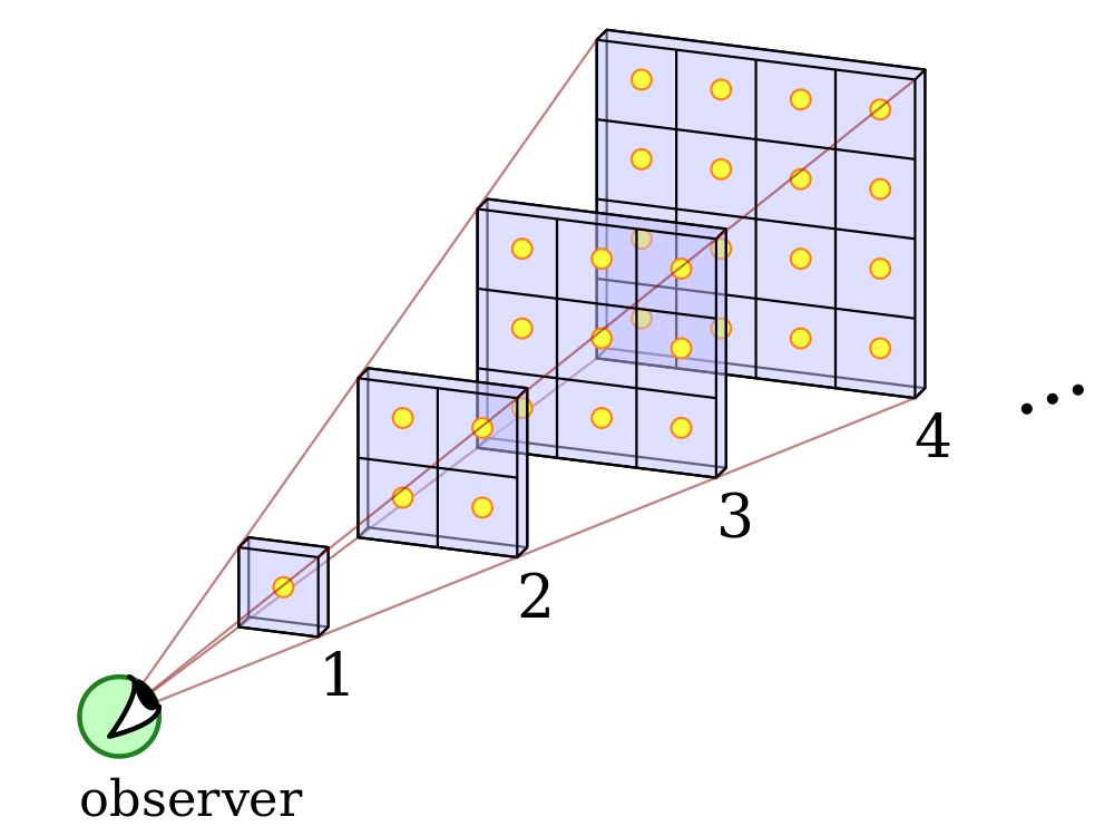 ►图3.奥伯斯佯谬示意图。如果宇宙中的恒星是均匀分布的,在任何一个视角,随着观测距离的增加,恒星在一个空间薄层里的数目随着距离平方增加。而恒星的视亮度则随着距离的平方衰减。如果将无限宇宙中所有恒星的贡献加起来,那么观测者接收到的光能回趋于无穷大。图片来源:文献[1]。
