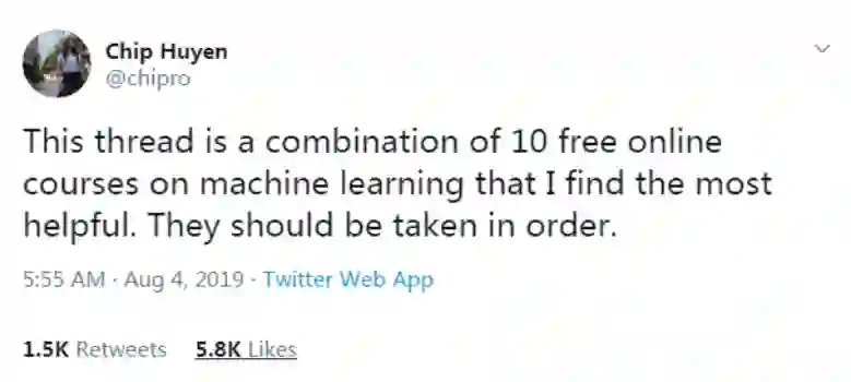 在本文中,来自英伟达人工智能应用团队的计算机科学家 Chip Huyen 不仅列出了十大优质的免费机器学习课程资源,还将其串成了一条高效的学习路线。