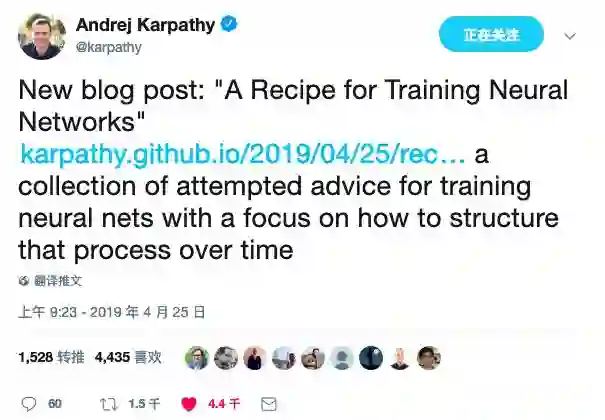 Karpathy的推特简介上有一句“I like to train Deep Neural Nets on large datasets.”近日,Karpathy将他训练神经网络的经验倾囊相授,获得大量好评。