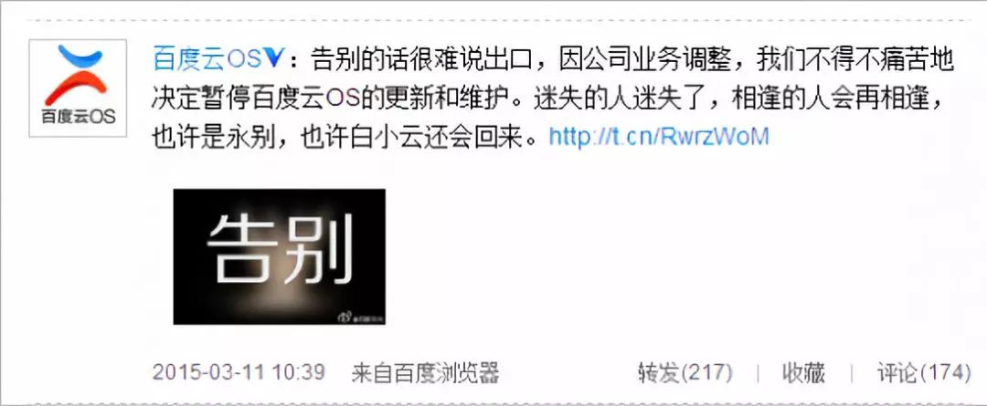 但好景不长,2015年1月,百分之百被传倒闭,旗下百加手机业务已暂停。2个月后,百度云OS发布公告称:“由于公司内部业务调整,百度云OS将于2015年3月11日起,暂停更新。”当时,百度云OS已发布6个正式版,迭代了67个公测版,适配超过150款机型,用户数超过1000万。