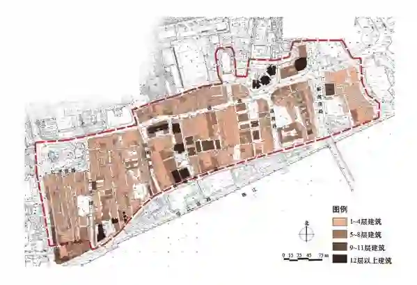 从一德路历史街区的建筑层高分布可以看出(图6),高层建筑大都建于 20 世纪 90 年代以后,不仅破坏了街区原本浓郁的历史环境,而且高层建筑带来的人口的高密度使一德路历史街区变得更为拥挤。此外,新老建筑之间缺少恰当的过渡、难以融合,这种不协调的关系对该历史街区的历史文化和建筑肌理造成了割裂,从而对地域文化特色和历史文脉的传承造成了严重的影响。