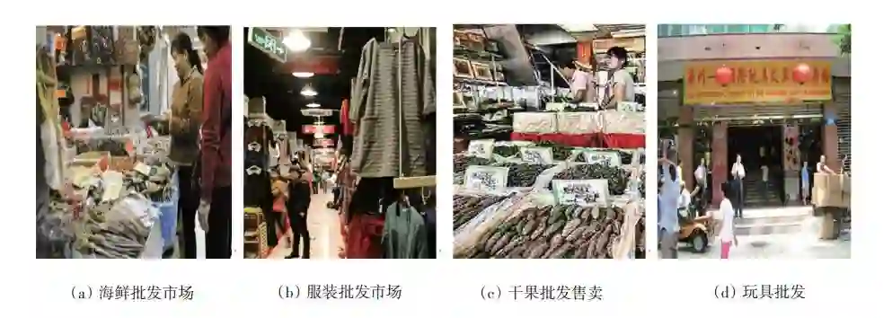 一德路历史街区是广州市越秀区非常繁华的街区。目前主要由干果菌类批发、海鲜干货、服装批发及精品玩具批发这 4大类型的商业业态组成,其分布特征主要为同类货物集中且互不交叉(图 8)。一德路商业街的商品售卖方式依旧是传统的线下销售,只有少部分线上销售。一德路商业市场主要由个体商户组成,由于个体商户素质参差不齐不利于管理,导致一德路商业街的商业氛围不太理想。
