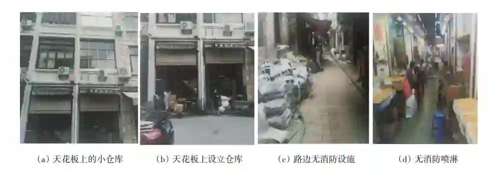 此外,一德路商业街存在比较严重的消防隐患。一德路商业街目前是以批发海鲜干货、玩具、服饰等商品为主,因此对仓储功能的要求较高,需要大面积的仓储用地。然而一德路商业街周围以住区为主,很少有仓储建筑,因此一德路商业街的许多商铺都没有存放货物的仓库。根据实际调研得知,有仓库的店铺主要是小商铺,大量密集的小商铺增加了后期商铺转移工作的难度。通过对一德路商业街沿街的观察,发现了几乎所有商铺都将吊顶设置为跃层以做临时仓库存储货物,且来安装灭火器,存在很大的安全隐患(图9)。