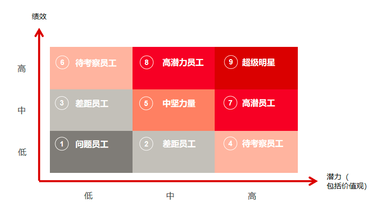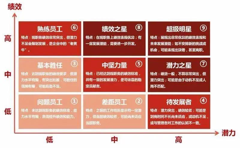 先看对角线上的格子,第1号格子员工会被淘汰,就是两项都不满足要求;第5号格子是两项都满足工作要求的正常员工,第9号格子是两项都突出的超级优秀员工,比如有一些优秀的管培生会分布在此,大胆提拔,激励无上限。
