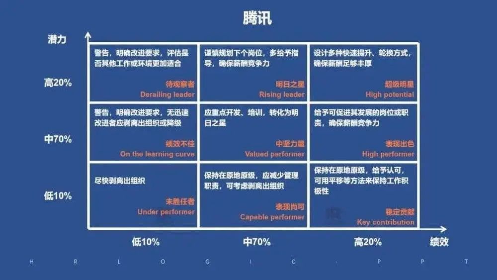 人才盘点结果输出为人才九宫格,也是大部分公司使用的工具,大同小异。比如腾讯和京东如下: