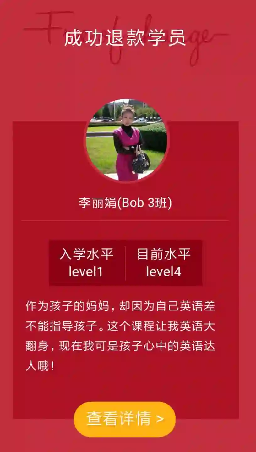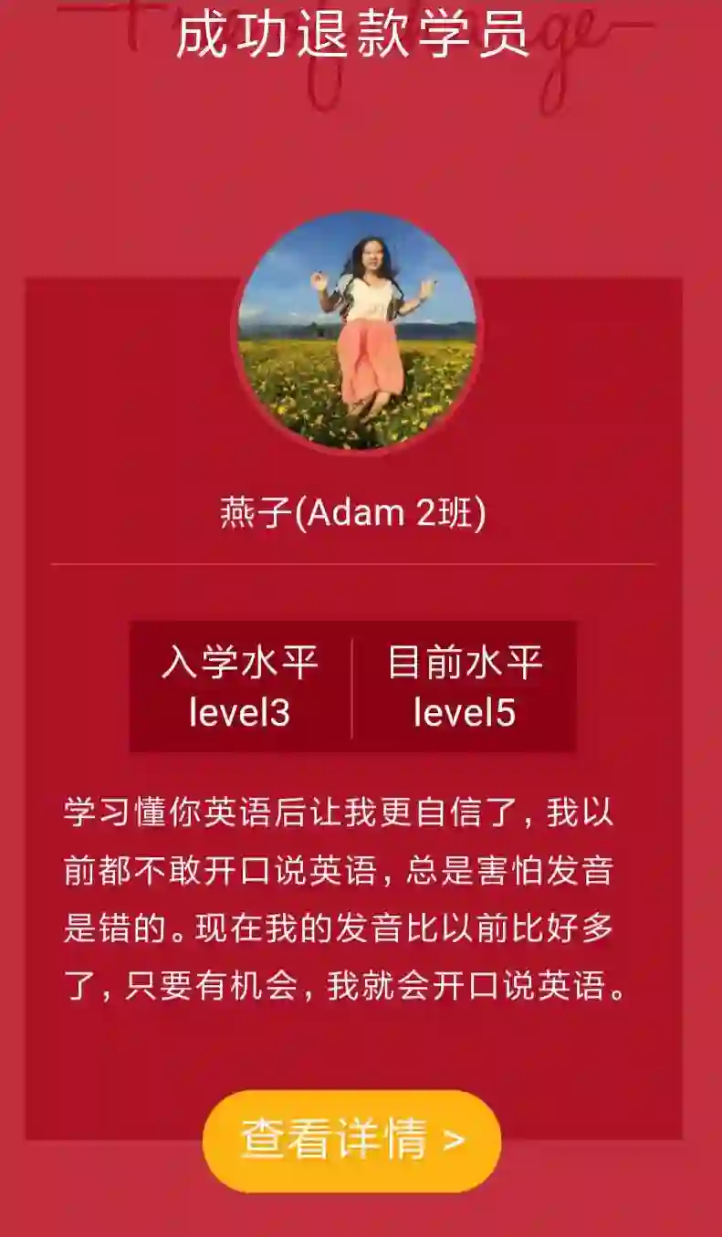 很多同学告诉我,他们坚持学下去主要是因为,半年期的懂你英语,学完达标,就能全额返学费。在返学费的背后,其实每个人都有自己的原动力。