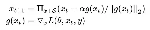 内部 max 的过程,本质上是一个非凹的约束优化问题,FGM 解决的思路其实就是梯度上升,那么 FGM 简单粗暴的“一步到位”,是不是有可能并不能走到约束内的最优点呢?当然是有可能的。于是,一个很 intuitive 的改进诞生了:Madry 在 18 年的 ICLR 中 [8],提出了用 Projected Gradient Descent(PGD)的方法,简单的说,就是“小步走,多走几步”,如果走出了扰动半径为 ϵ 的空间,就映射回“球面”上,以保证扰动不要过大:
