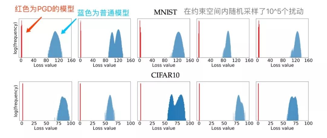 在 [8] 中,作者将这一类通过一阶梯度得到的对抗样本称之为“一阶对抗”,在实验中,作者发现,经过 PGD 训练过的模型,对于所有的一阶对抗都能得到一个低且集中的损失值,如下图所示: