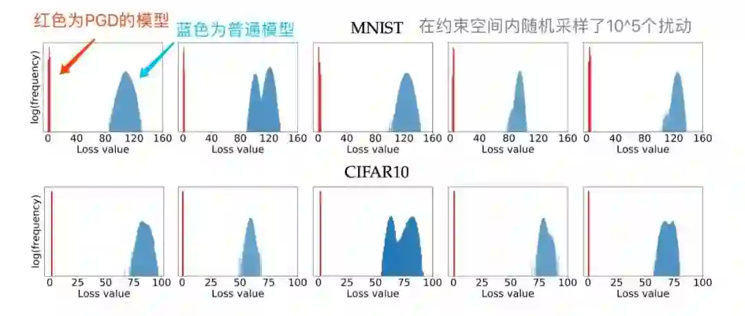我们可以看到,面对约束空间 S 内随机采样的十万个扰动,PGD 模型能够得到一个非常低且集中的 loss 分布,因此,在论文中,作者称 PGD 为“一阶最强对抗”。也就是说,只要能搞定 PGD 对抗,别的一阶对抗就不在话下了。