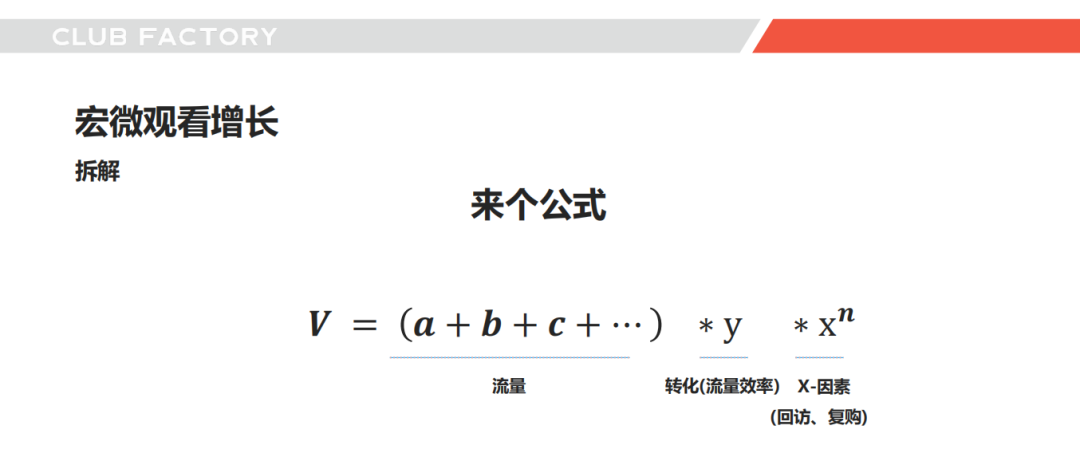 接下来从宏观和微观分别论述下我们对增长问题的见解,一般大家遇到增长问题喜欢拆解,这里把规模分别拆解成了流量乘以转化乘以回访和复购,回访和复购我称之为X因素,因为其实他比转化更难把握,转化更加短期更加当下,但是X因素才是企业最终能够笑到最后的本质,相信大家也听过1.01的365次方和0.99的365次方的故事,复利思维可以带来恐怖的增长或衰退。