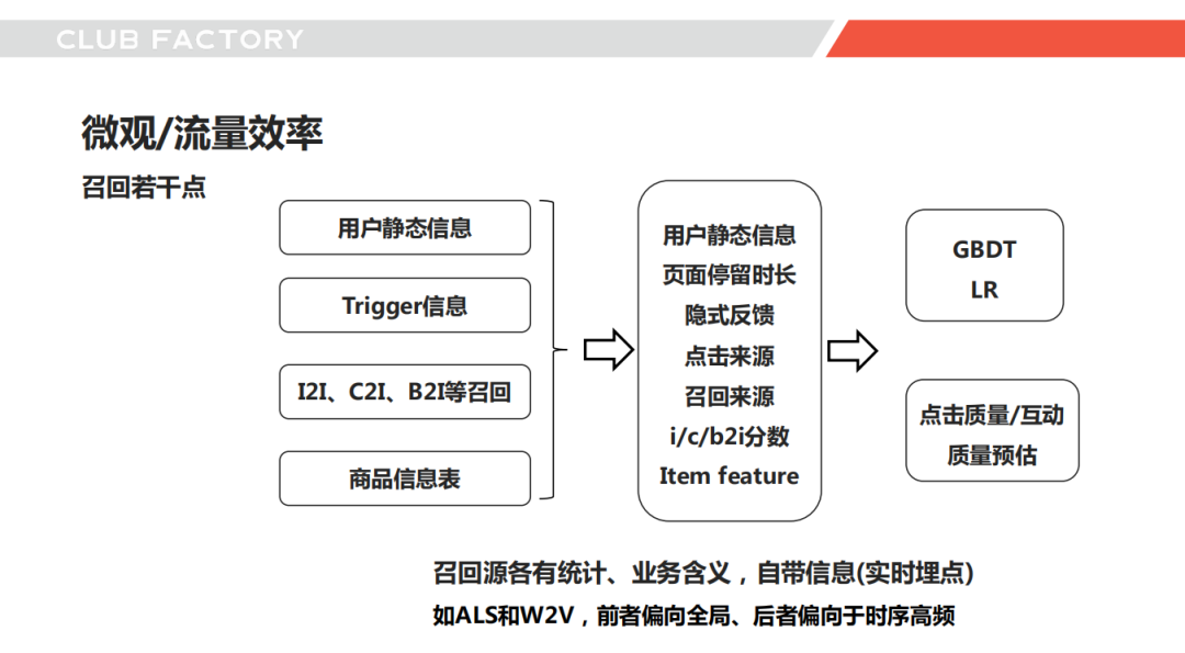 接下来我们进入微观/流量效率这个模块进行一些细粒度地探讨,上面这个图是做推荐的人再熟悉不过的了,从召回到最终展现,层层筛选商品,最终用户根据结果进行反馈,大模块间串联、前后依赖,这里我想分享自己的一些感悟是数据流是漏斗从大到小的,我们是正着用,但是往往很多时候我们没有系统化细粒度地去观察和理解,我称之为反着看。何解呢,就是门当户对的概念,今天你死命优化召回,但是排序太弱了,没效果,今天你死命优化排序,召回太弱了,没效果。推荐系统因为串联和前后依赖的原因,短板效应非常明显,一方超前和落后迭代效果都是不明显的,我们结合具体实例进行讲解。