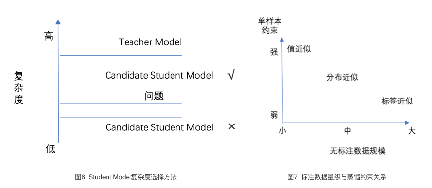 根据无标注数据的规模,蒸馏使用的约束可以不同。如图7所示,如果无标注数据规模小,可以采用值(logits)近似进行学习,施加强约束;如果无标注数据规模中等,可以采用分布近似;如果无标注数据规模很大,可以采用标签近似进行学习,即只使用Teacher Model的预测标签来指导模型学习。