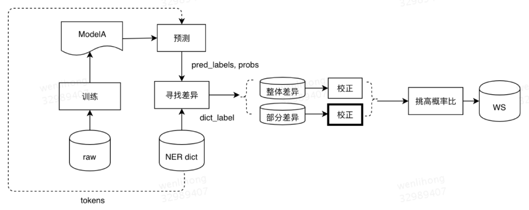 (2)词典数据预测:实体识别模块目前沉淀下百万量级的高质量实体数据作为词典,数据格式为实体文本、实体类型、属性信息。用上一步得到的ModelA预测改词典数据输出实体识别结果。