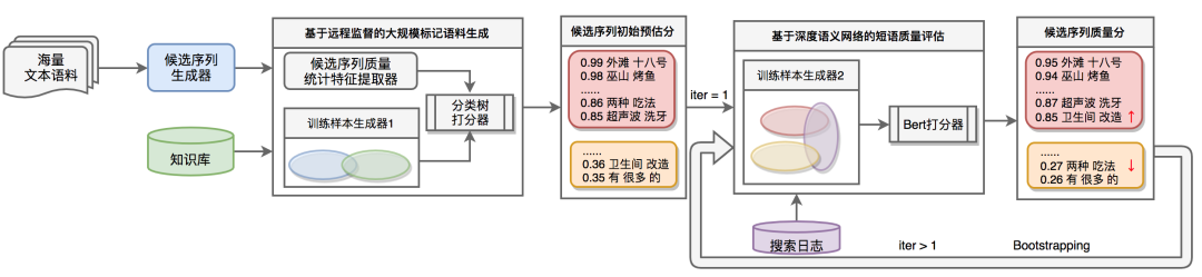 Step3: 基于深度语义网络的短语质量评估。在有大量标记数据的情况下,深度网络模型可以自动有效地学习语料特征,并产出具有泛化能力的高效模型。BERT通过海量自然语言文本和深度模型学习文本语义表征,并经过简单微调在多个自然语言理解任务上刷新了记录,因此我们基于BERT训练短语质量打分器。为了更好地提升训练数据的质量,我们利用搜索日志数据对Step2中生成的大规模正负例池数据进行远程指导,将有大量搜索记录的词条作为有意义的关键词。我们将正例池与搜索日志重合的部分作为模型正样本,而将负例池减去搜索日志集合的部分作为模型负样本,进而提升训练数据的可靠性和多样性。此外,我们采用Bootstrapping方式,在初次得到短语质量分后,重新根据已有短语质量分以及远程语料搜索日志更新训练样本,迭代训练提升短语质量打分器效果,有效减少了伪正例和伪负例。