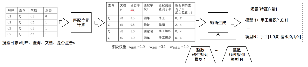 Step1:匹配位置计算。对搜索日志进行处理,重点计算查询与文档字段的详细匹配情况以及计算文档权重(比如点击率)。如图9所示,用户输入查询是“手工编织”,对于文档d1(搜索中就是POI),“手工”出现在字段“团单”,“编织”出现在字段“地址”。对于文档2,“手工编织”同时出现在“商家名”和“团单”。匹配开始位置、匹配结束位置分别对应有匹配的查询子串的开始位置以及结束位置。