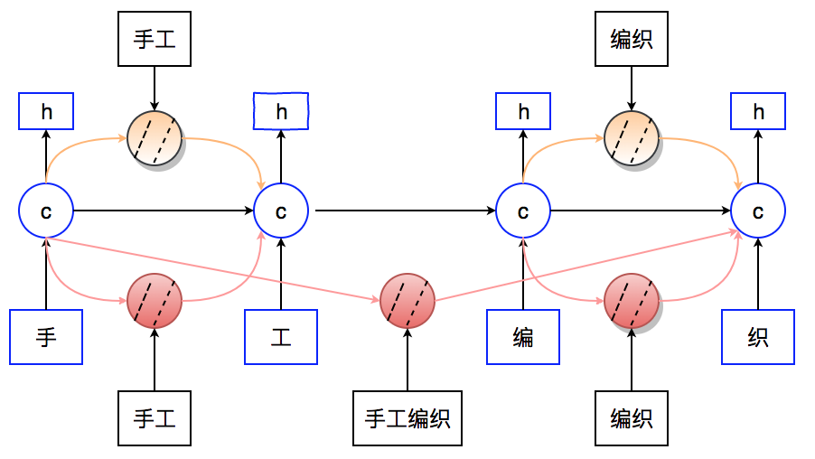 模型结构如图11所示,蓝色部分表示一层标准的LSTM网络(可以单独训练,也可以与其他模型组合),输入为字向量,橙色部分表示当前查询中所有词向量,红色部分表示当前查询中的通过Step1计算得到的所有短语向量。对于LSTM的隐状态输入,主要由两个层面的特征组成:当前文本语义特征,包括当前字向量输入和前一时刻字向量隐层输出;潜在的实体知识特征,包括当前字的短语特征和词特征。下面介绍当前时刻潜在知识特征的计算以及特征组合的方法。(下列公式中,σ表示sigmoid函数,⊙表示矩阵乘法)