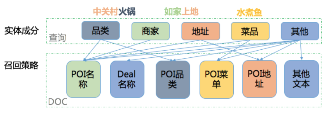 我们的解决方法如下图1所示,让特定的查询只在特定的文本域做倒排检索,我们称之为“结构化召回”,可保证召回商家的强相关性。举例来说,对于“海底捞”这样的请求,有些商家地址会描述为“海底捞附近几百米”,若采用全文本域检索这些商家就会被召回,显然这并不是用户想要的。而结构化召回基于NER将“海底捞”识别为商家,然后只在商家名相关文本域检索,从而只召回海底捞品牌商家,精准地满足了用户需求。