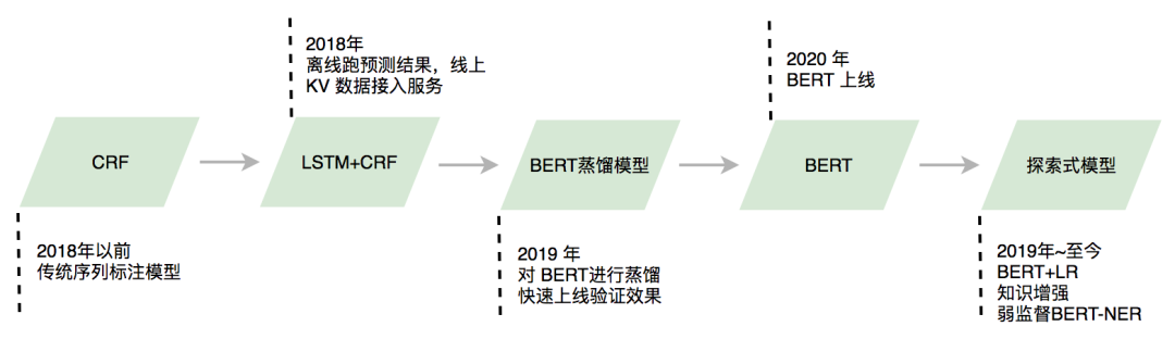 对于长尾、未登录查询,我们使用模型进行在线识别。NER模型的演进经历了如下图5所示的几个阶段,目前线上使用的主模型是BERT[3]以及BERT+LR级联模型,另外还有一些在探索中模型的离线效果也证实有效,后续我们会综合考虑性能和收益逐步进行上线。搜索中NER线上模型的构建主要面临三个问题:
