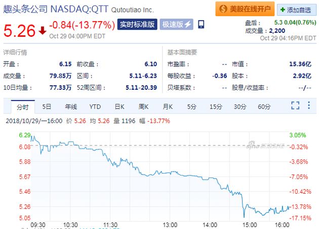 @新浪科技【趣头条周一大跌逾13%,创上市以来股价新低】10月30日凌晨消息,趣头条(NASDAQ:QTT)开盘后持续走低,截至收盘,趣头条报5.26美元,跌幅达13.77%,市值15.36亿美元。9月14日,趣头条正式在纳斯达克挂牌上市。上市首日股价一度飙升190%至20.3美元,最终收涨128%。之后,其股价一直处于“过山车式”的涨跌中。