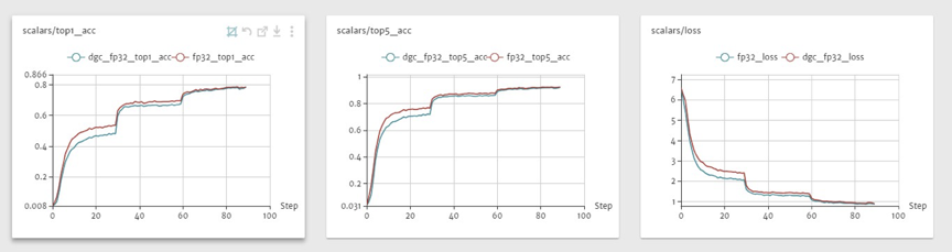 收敛效果:基于 Imagenet 数据集,Resnet50 模型的收敛效果在稀疏通信下与常规的并行训练方法没有损失,证明了稀疏通信训练方法的有效性。