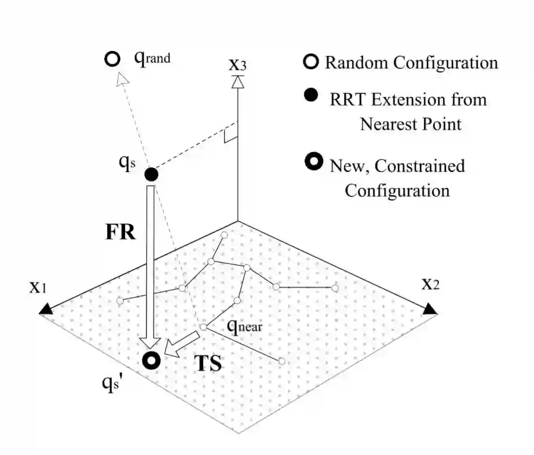 但是,我们可以从另一个角度看问题。机器人的末端姿态就是一个 SE(3) 李群。保持末端水平,可以认为是一个 R3 空间与 SO(2) 空间的半直积,这也是一个李群。于是,我们可以直接在李群内或者 Tangent Space 上跑一个 RRT,例如 Tangent Bundle RRT[6]与 AtlasRRT[7]