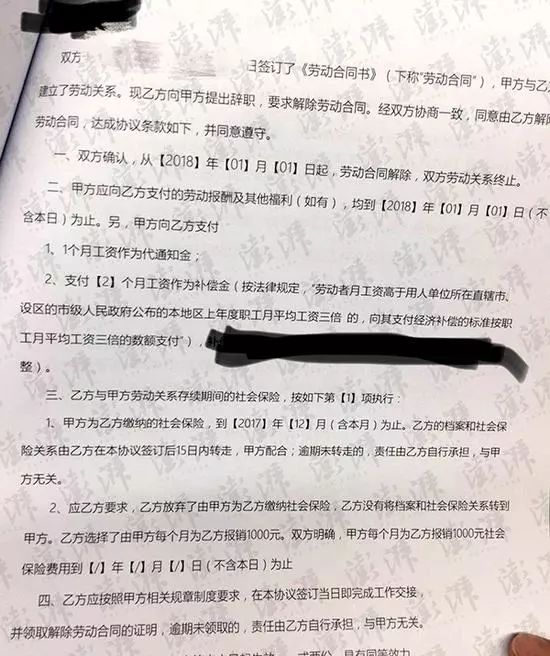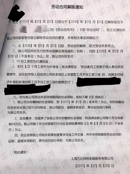 澎湃新闻获得的这份《劳动合同解除通知》内容显示,公司与员工从2018年1月1日起解除劳动合同,此外,万达网科向离职员工支付1个月工资作为代通知金,支付2个月工资作为补偿金,万达网科为员工缴纳的社会保险到2017年12月为止。