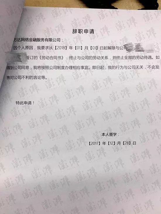 同时,万达网科要求员工提交个人提交的辞职申请。内容显示,“因个人原因,我要求从2018年1月1日起解除与公司于X年X月X日签订的《劳动合同书》,终止与公司的劳动关系,并终止全部的劳动待遇……即日起,我的行为与公司无关,不会发表对公司不利的言论等。”