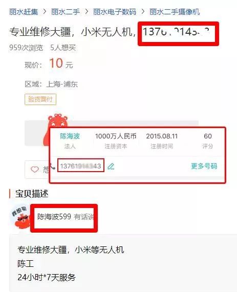 根据手机信息和姓名,我们可以发现,在2017年前,陈海波还是一个维修大疆无人机为主业的修理工,在几乎所有的同城服务网站上留下了自己的联系方式,但在2017年后,他开始真正扮演起了意零(上海)金融信息服务有限公司CEO的角色。
